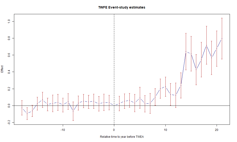 summary(feols(patents ~ twea | subclass + year, data = df, cluster = ~subclass))Ejemplo 1 (feols with i(year)):