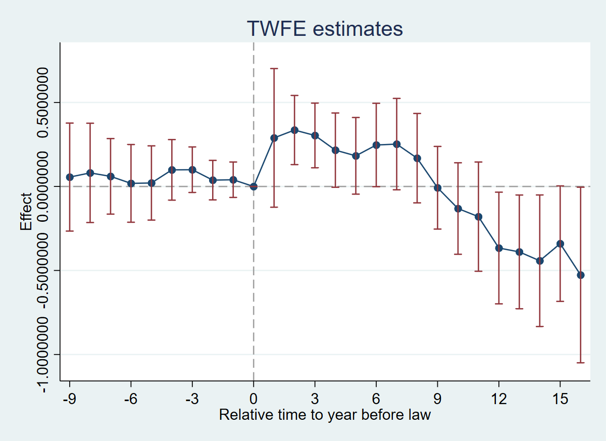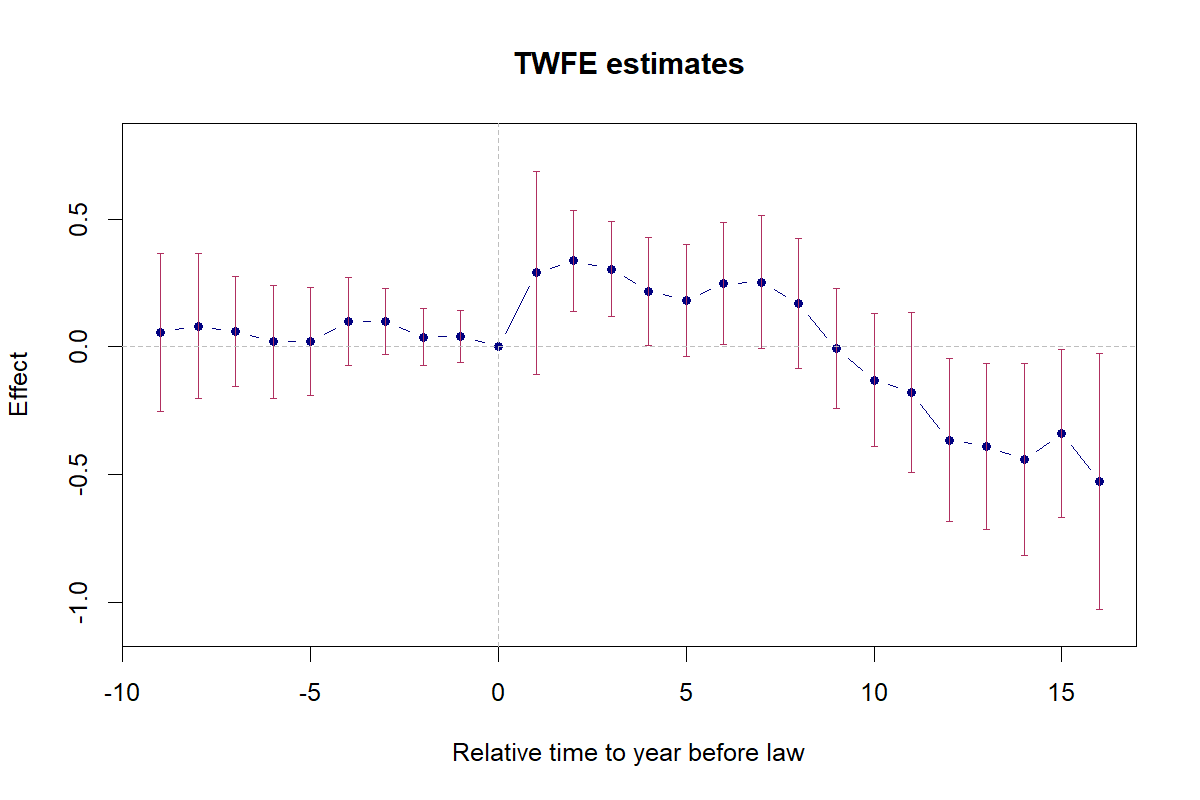 Interpretation: \(\hat{\beta}_{fe} = -0.055\) (s.e. = 0.15, p = 0.72). The coefficient is small and insignificant — according to this regression, UDLs do not affect divorce rates.