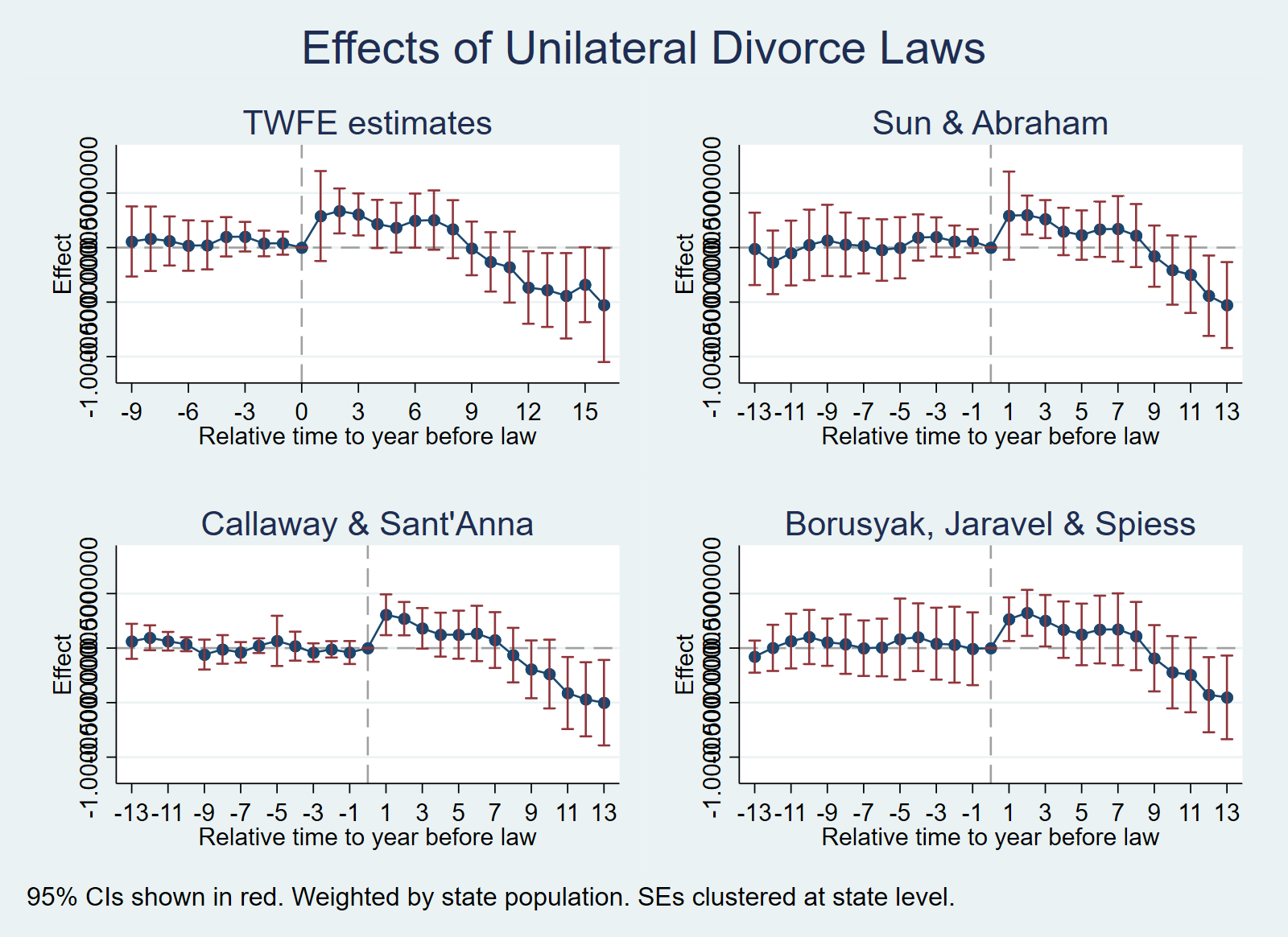 graph combine fig62 g1 g2 g4, cols(2) title("Effects of Unilateral Divorce Laws") note("95% CIs shown in red. Weighted by state population. SEs clustered at state level.")