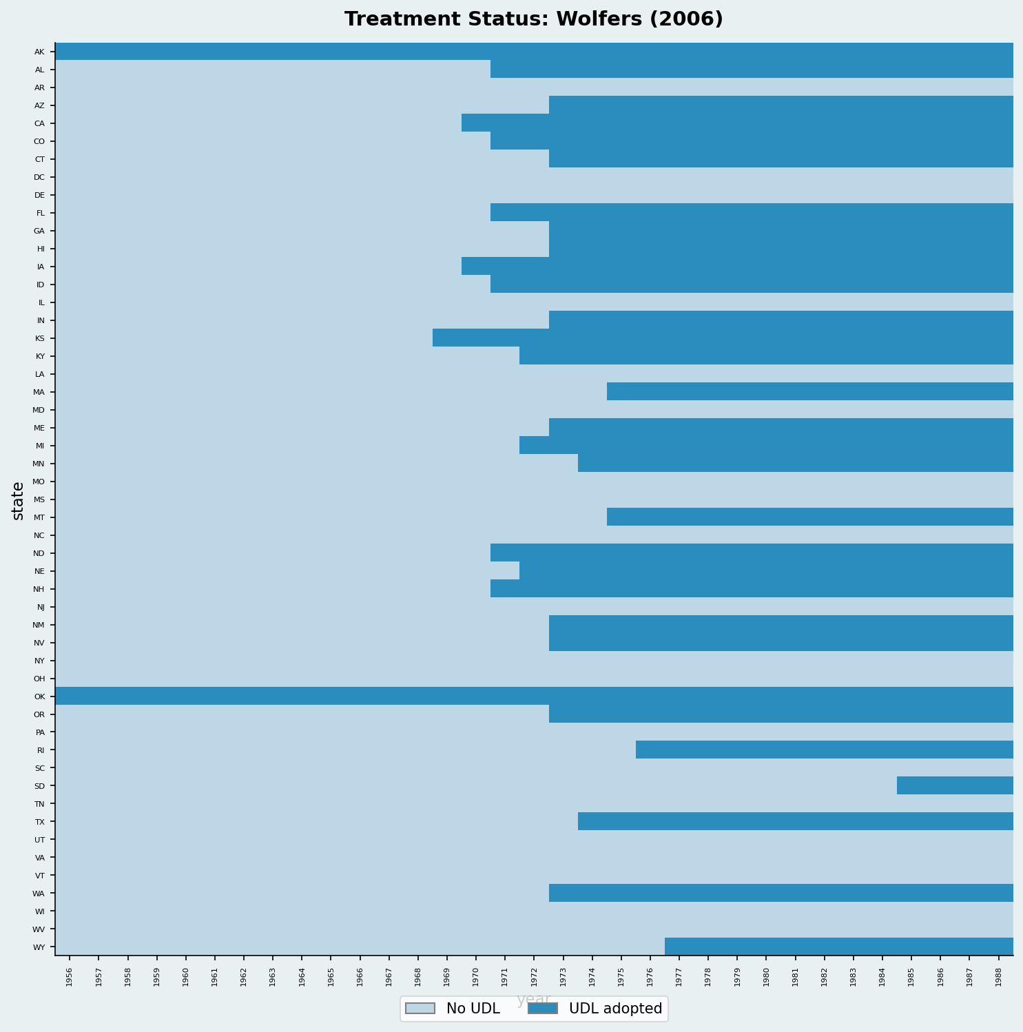panelview div_rate udl, i(state) t(year) type(treat) title("Treatment Status: Wolfers (2006)") legend(label(1 "No UDL") label(2 "UDL adopted"))library(panelView)